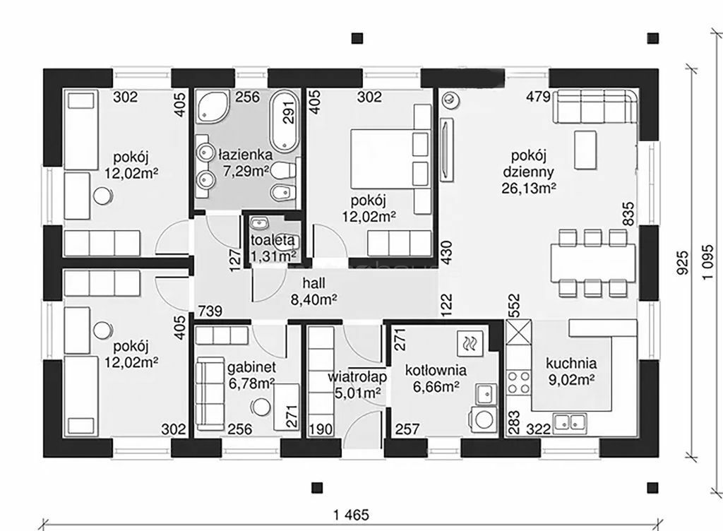 Oferowany dom posiada komfortowe rozmieszczenie pomieszczeń: